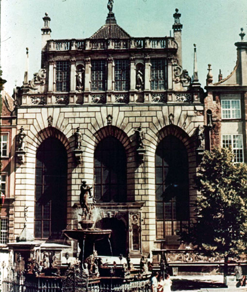 pl-1600.jpg ( JPEG Image ) 03/03/1998 GdanskDwór Artusa - Artus Court23-Aug-1975Built 1476-1481, with the fountain of Neptune in the foreground